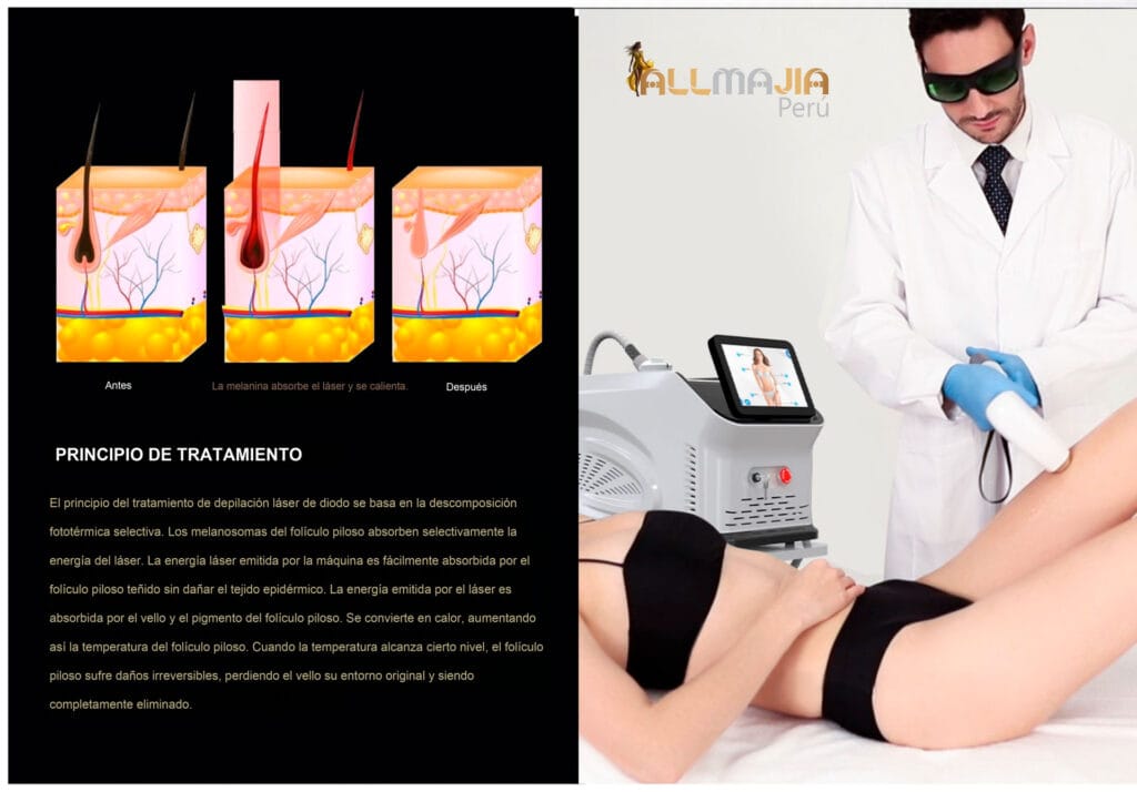 Ajustando correctamente la longitud de onda y el ancho de pulso del láser, este puede penetrar Ia capa superficial de la piel y alcanzar el folículo piloso. Allí, la energía lumínica se absorbe y se convierte en energía térmica, Ia cual destruye el folículo. De esta manera, el láser impide que el vello se regenere sin dañar el tejido circundante.