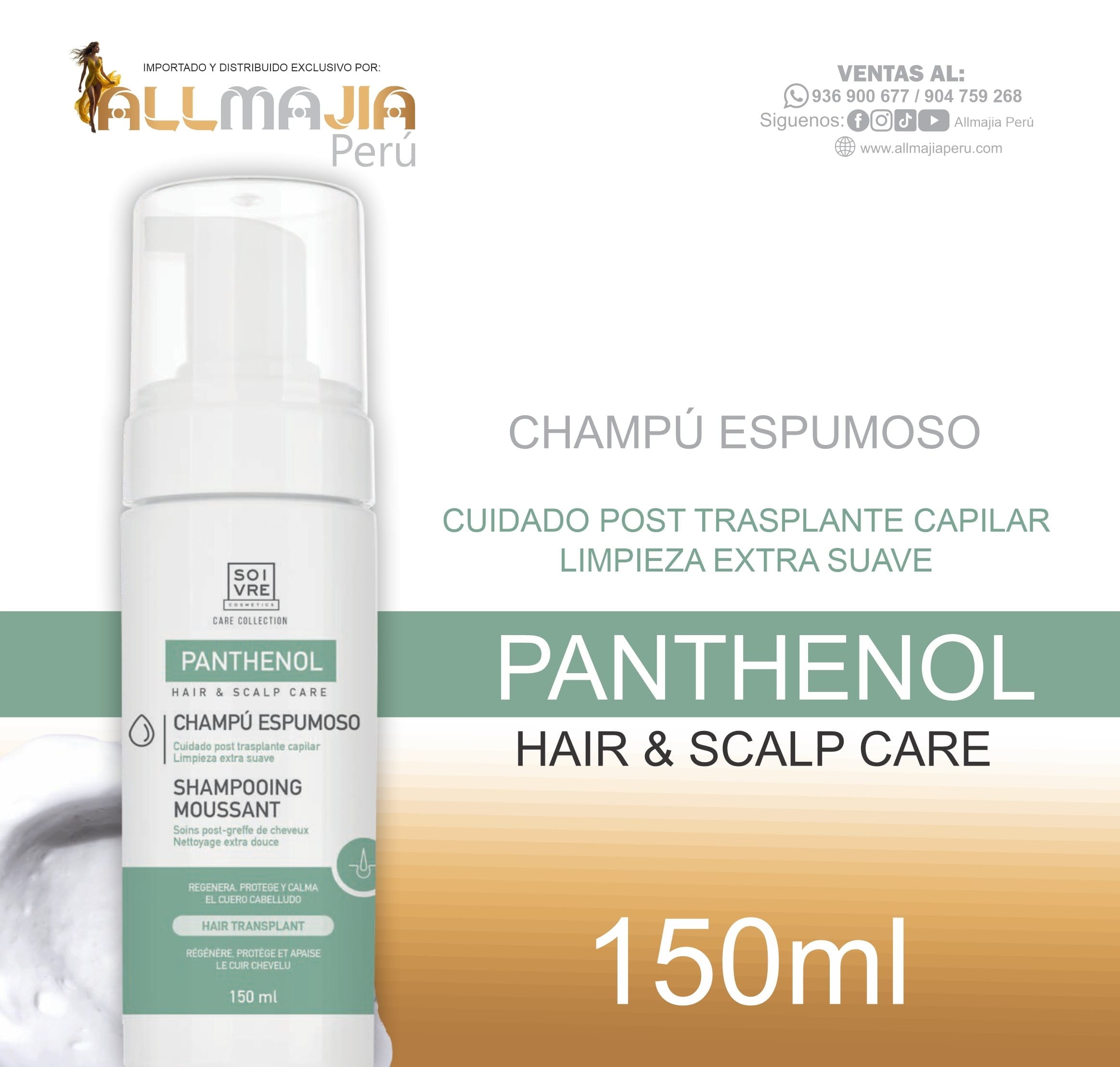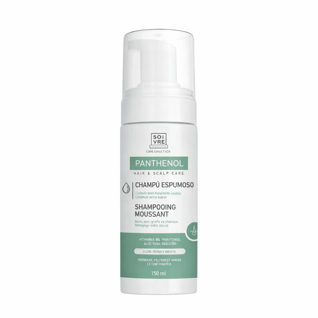El Champú espumoso Panthenol está indicado para limpiar y cuidar el cuero cabelludo sensible y sano tras un transplante capilar. Fórmula ultraligera y delicada a base de Panthenol, Aloe vera, Alantoína, Ácido hialurónico y Vitamina E, con pH neutro y sin sulfatos, para una higiene suave y sin necesidad de frotar.